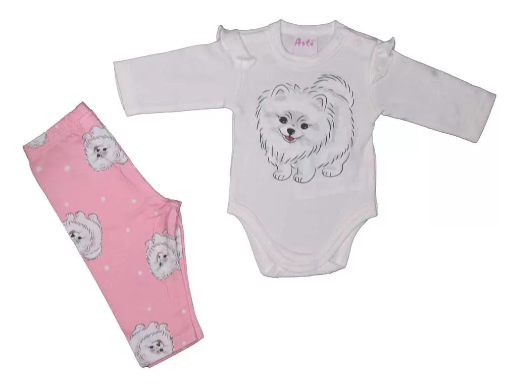 2 részes kislány szett cuki Spitz mintávalA kislányos szett egy hosszú ujjú, fodros vállú bodyból és egy kényelmes babanadrágból áll, mindkettőn aranyos spitz mintával díszítve. Kiváló minőségű, puha pamut anyagból készült, amely nem csak kényelmes viseletet biztosít a kicsiknek, de könnyen mosható is, színe és formája hosszan megőrzi frissességét. A nadrág rugalmas anyaga pedig tökéletesen alkalmazkodik a babák aktív mozgásához. A termék nikkelmentes patenttal készül, így az arra érzékeny babáknál sem vált ki allergiás reakciót. Egy igazán prémium minőségű, magyarországi termék, amelyet anyukák és babák egyaránt imádni fognak!Minőségi magyar termékAnyaga: 90% pamut és 10% elasztánMinőség: I. osztály