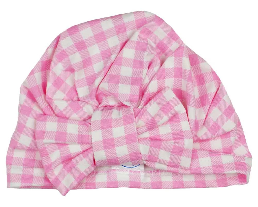 Kockás mintával nyomott, masnival díszített baba sapka.