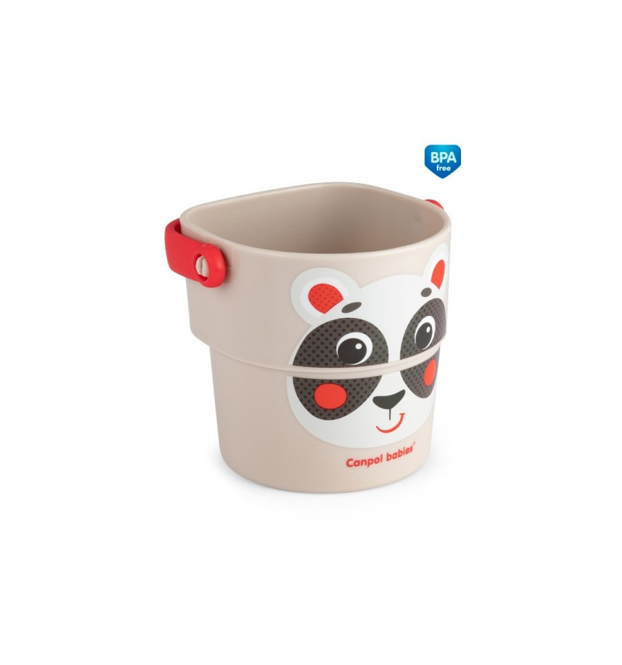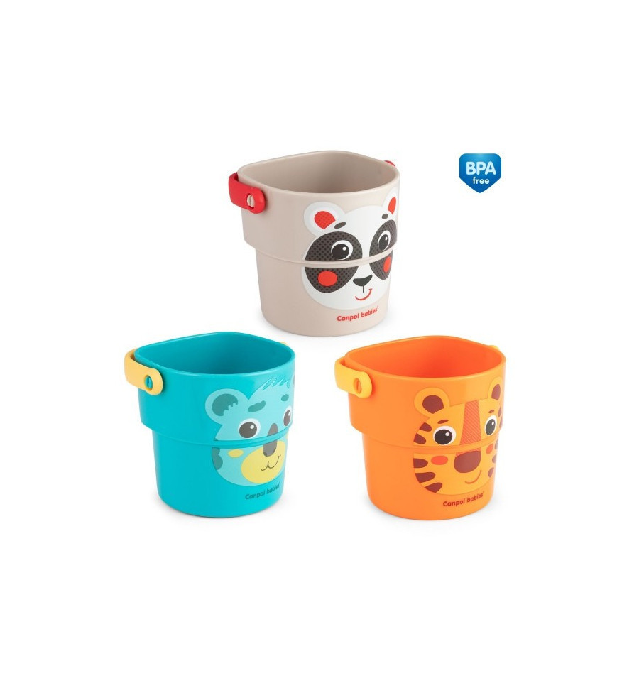 Canpol Babies színes vödröcskék a Hello Little kollekcióból, melyek figyelemfelkeltő mintájukkal ideálisak fürdőjátékként, sétákon vagy a homokozóba.