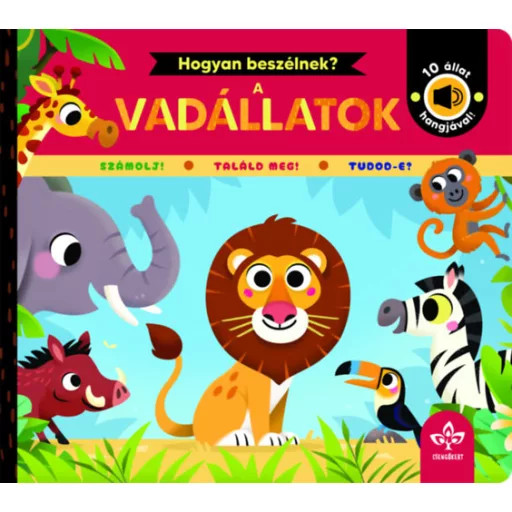Tudjátok-e, hogyan beszélnek a vadállatok? Egyik bömböl, másik sziszeg, a harmadik trombitál! Ebben a kiadványban 10 állatot mutatunk be a vadonból, és mindegyik hangját hallhatjuk, ha megnyomjuk a mellette levő gombot. Érdekes felfedezéseket tehetünk, hiszen mindről megtudunk valamit: hol él, mi jellemző rá, miért olyan a külseje, amilyen.Minden oldalon egy kis feladat vár ránk, meg kell számolni a képen bemutatott állatokat. Egyszóval, unatkozni nem lehet, nyissuk ki fülünk, szemünk, biztassuk a gyerekeket, nyomják meg a gombokat és élvezzék a könyv nyújtotta lehetőségeket. Meséljünk a témáról és meséltessünk! Kitűnő lehetőség ez a szókincsfejlesztésre, koncentrációra, megfigyelésre, az auditív kompetenciák fejlesztésére és a kellemesen eltöltött közös időre.