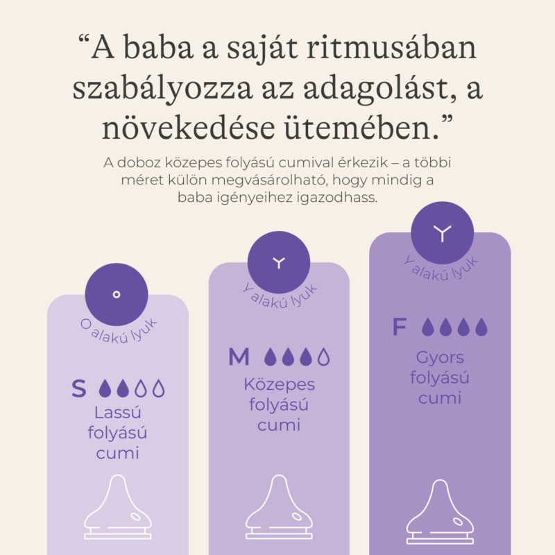 Egyszerű váltás a begyakorlott szoptatásról a cumisüvegre és vissza. A puha és rugalmas cumi segít fenntartani a babának a már kialakult szopási módot.