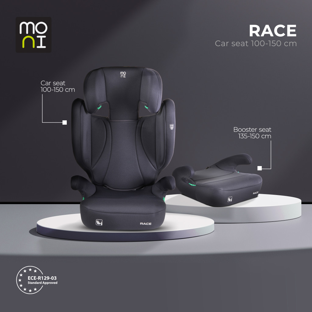 A Moni Race autósülés a legújabb R129/i-Size európai biztonsági szabványnak megfelelően készült, így ideális választás a gyermek biztonságos utazásához 100 és 150 cm közötti magasság esetén. Az ülés együtt nő a gyermekkel – a magas háttámlás módtól egészen az ülésmagasító funkcióig egyszerűen alakítható.