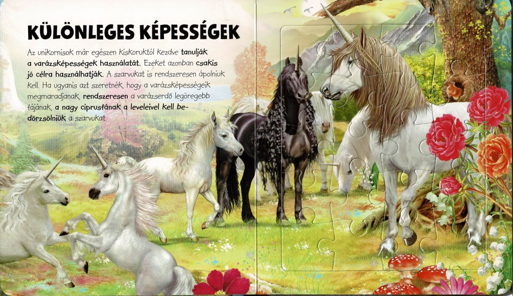 A Szuper puzzle – Unikornisok a víz alatti világ nyugodt, elmélyülős felfedezésére hív. A 6 db, egyenként 20 darabos puzzle változatos, mégis jól átlátható jelenetekkel dolgozik, így a gyerekek könnyen találnak kiindulópontot: egy jellegzetes forma, egy színátmenet vagy egy mozdulat segít elindulni, majd a részletek finom illesztése építi fel a teljes képet. A kirakás folyamata természetes ritmust ad – koncentráció, megfigyelés, illesztés, visszalépés, újrapróbálás –, amelyben a gyerekek megtapasztalják a fókuszált figyelem örömét.