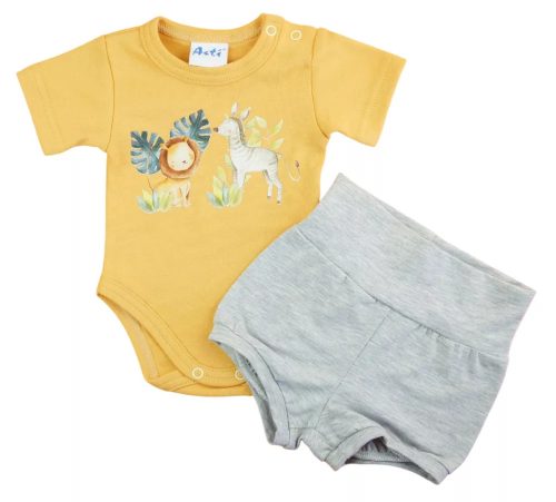 A kisfiúk divatjának legújabb trendjét képviseli ez a 2 részes szett, amelynek minden darabja Magyarországról származik. A szett egy magasderekú rövidnadrágot és egy egyszínű rövid ujjú bodyt tartalmaz, igazán vagány és kispasis hangulatot kölcsönöz viselőjének. Mindkét darab finom pamut anyagból készült, a nadrág rugalmas pamutja pedig szabad mozgást biztosít a babának. A szett kiváló minőségű, jól mosható, szín- és formatartó anyaga miatt nemcsak a babák, de az anyukák kedvence is lesz! A body 100% pamutból, a nadrág 90% pamutból és 10% elasztánból készült, ezáltal biztosítva a kiváló minőséget. A termék nikkelmentes patenttal készül, így az érzékeny babák sem fognak allergiás reakciót tapasztalni.