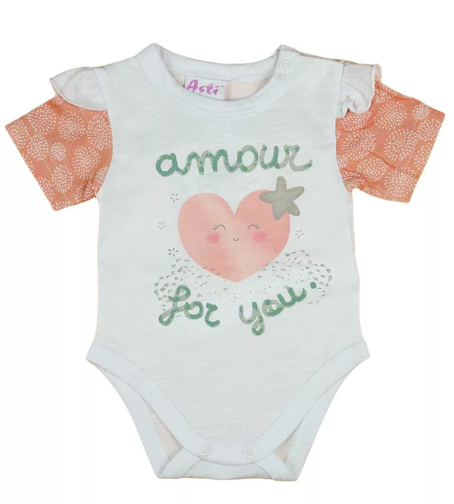 Alapvető ruhadarab babáknak, jól kombinálható más ruhákkal. Elején cuki Szivecske mintával nyomott. A picik bőrére nagyon kell vigyázni hogy semmi se iritálja ez a termék 100% Pamutból készült. Tisztítása nagyon könnyű.