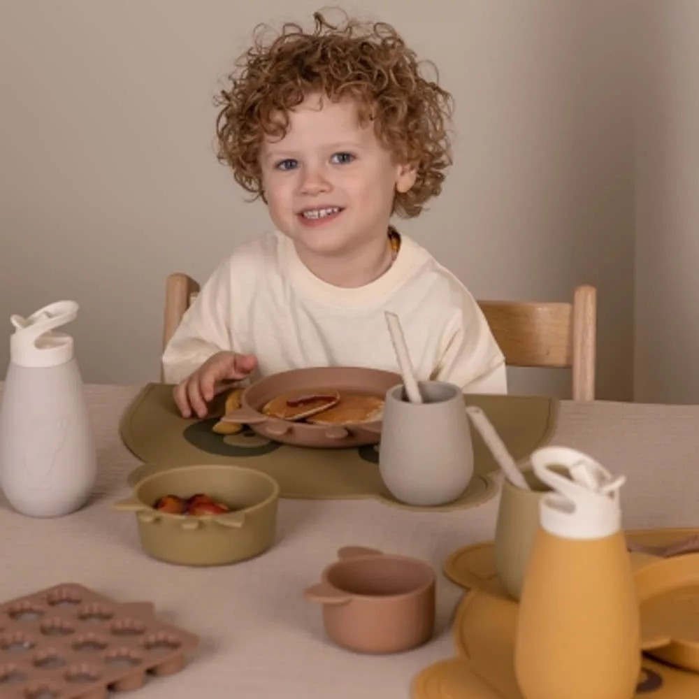 VÓPALACK SZILIKONBÓLIvópalack egy cirkuszi elefánt aranyos képével. A palack 100% LFGB szilikonból készül, amely káros vegyi anyagoktól mentes és élelmiszerekhez engedélyezett. A fedél műanyagból készül, és szorosan illeszkedik a palackhoz.