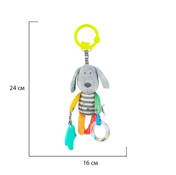 A kutyus mancsain található puha rágóka hatékony segítséget nyújt a fogzási időszakban, megnyugtatva az érzékeny ínyt. A játék része egy csilingelő gyűrű is, amely színes golyókkal van töltve, így hanghatásával tovább fokozza a baba érdeklődését és figyelmét.
